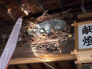 御拝殿正面にある木彫りの玄武と、龍